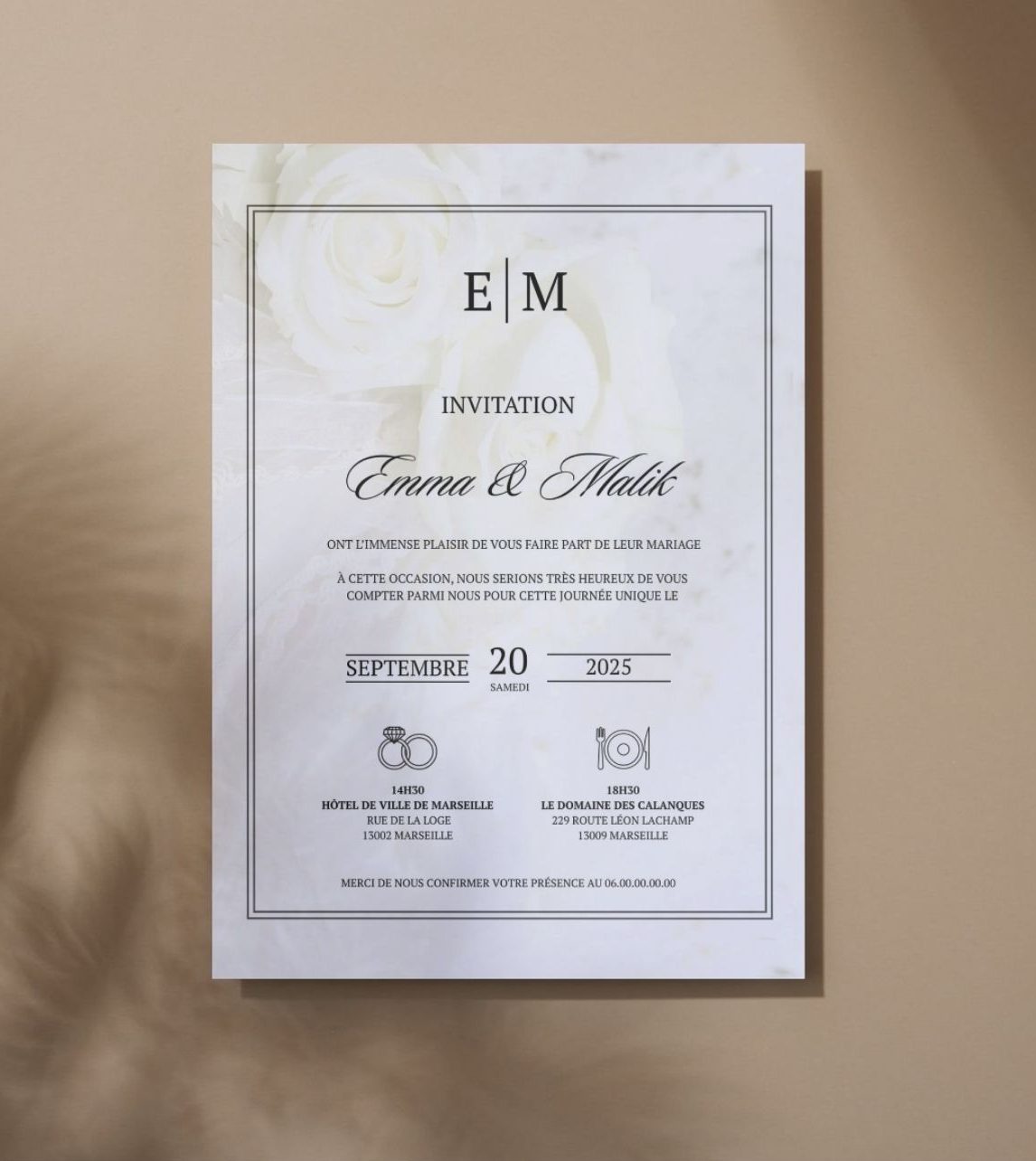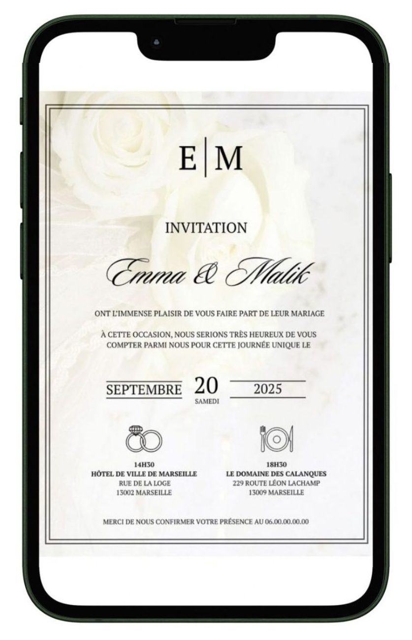 Vous recevez votre invitation personnalisée par mail, en formats JPG et PDF, prête à être envoyée en quelques secondes pour annoncer ce moment précieux avec simplicité, modernité et raffinement.